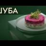Салат "Шуба від шефа" зі слабосолоного оселедця, відварного буряка, картоплі і моркви, тертого плавленого сирка з майонезом, прикрашений яєчним жовтком та свіжою зеленню.